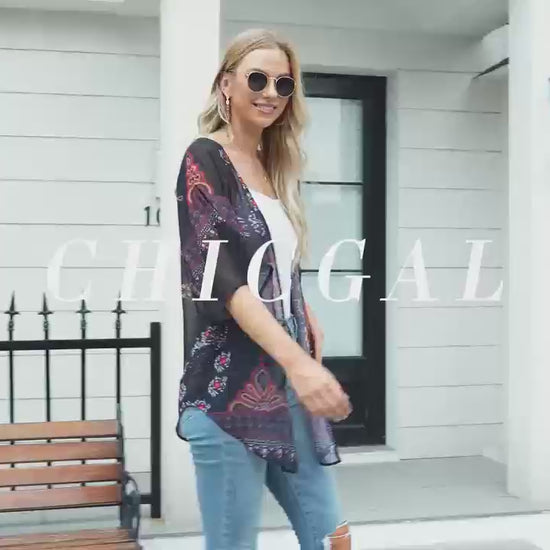 Sizes: S = US size 4-6, M = US size 8-10, L = US size 12-14, XL = US size 16-18, 2XL = US size 20-22, 3XL = US size 24-26, 4XL = US size 28-30, 5XL = US size 32+: Various colors are available for selection. This floral cardigan is a casual summer oversized top, a kimono beach cover-up, a chiffon shirt, a front-buttoned shirt, with silk patches, loose balloon sleeves. The material is made of chiffon, with a transparent fabric, good breathability, soft touch, and lightweight comfort. This kimono can be worn over a tank top or shorts, even as a belted outerwear or base pants. Additionally, there is a kimono skirt. Floral kimono is a fashionable summer outfit choice.